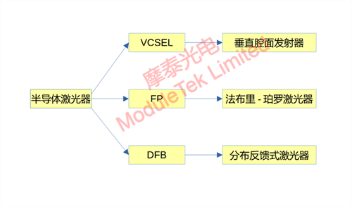 There are three common types of lasers used in optical modules: Vertical-Cavity Surface-Emitting Laser (VCSEL), Fabry-Perot Laser (FP), and Distributed Feedback Laser (DFB).