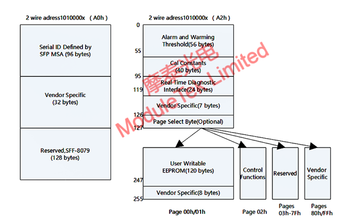A2h mainly contains the functional data of the module. During normal operation, this data area is generally set to write-protected mode to prevent data tampering that may affect the module’s normal use. This data table includes information such as module operation alarm thresholds, Digital Diagnostic Monitoring (DOM or DDM) functions, several status control bytes, as well as module calibration and debugging data.