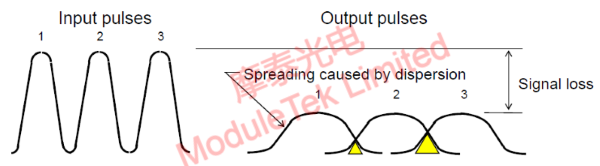 Dispersion, also known as pulse broadening, is a physical characteristic of optical signal transmission in optical fibers. Its specific manifestations are as follows: input signal pulses are distinct and non-overlapping; output pulses show pulse broadening, leading to pulse overlap and indistinguishability between pulses; the optical fiber bandwidth decreases as dispersion increases. See the figure below for details: