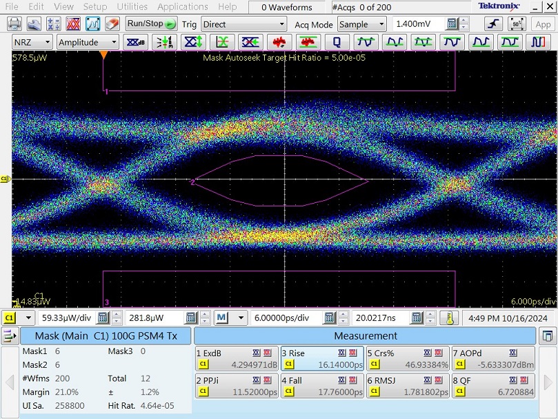 The sample module enclosure was tested at 45°C optical eye diagram with the following eye diagram template and parameters: