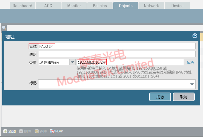 2. Navigate to Objects > Addresses column and click Add to create IP address on the web end, you need to create two IP addresses, which are the IP address of the PA-3060 interface and the IP address of the interface of the opposite switch, hereinafter referred to as the local IP address and the peer IP address;