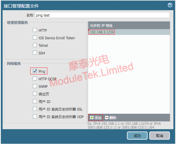 4. In the Network>Network Profile>Interface Management column, click Add to create an interface management profile, set the name, check Ping in Network Service, and add the peer IP address in the Allowed IP Addresses column;